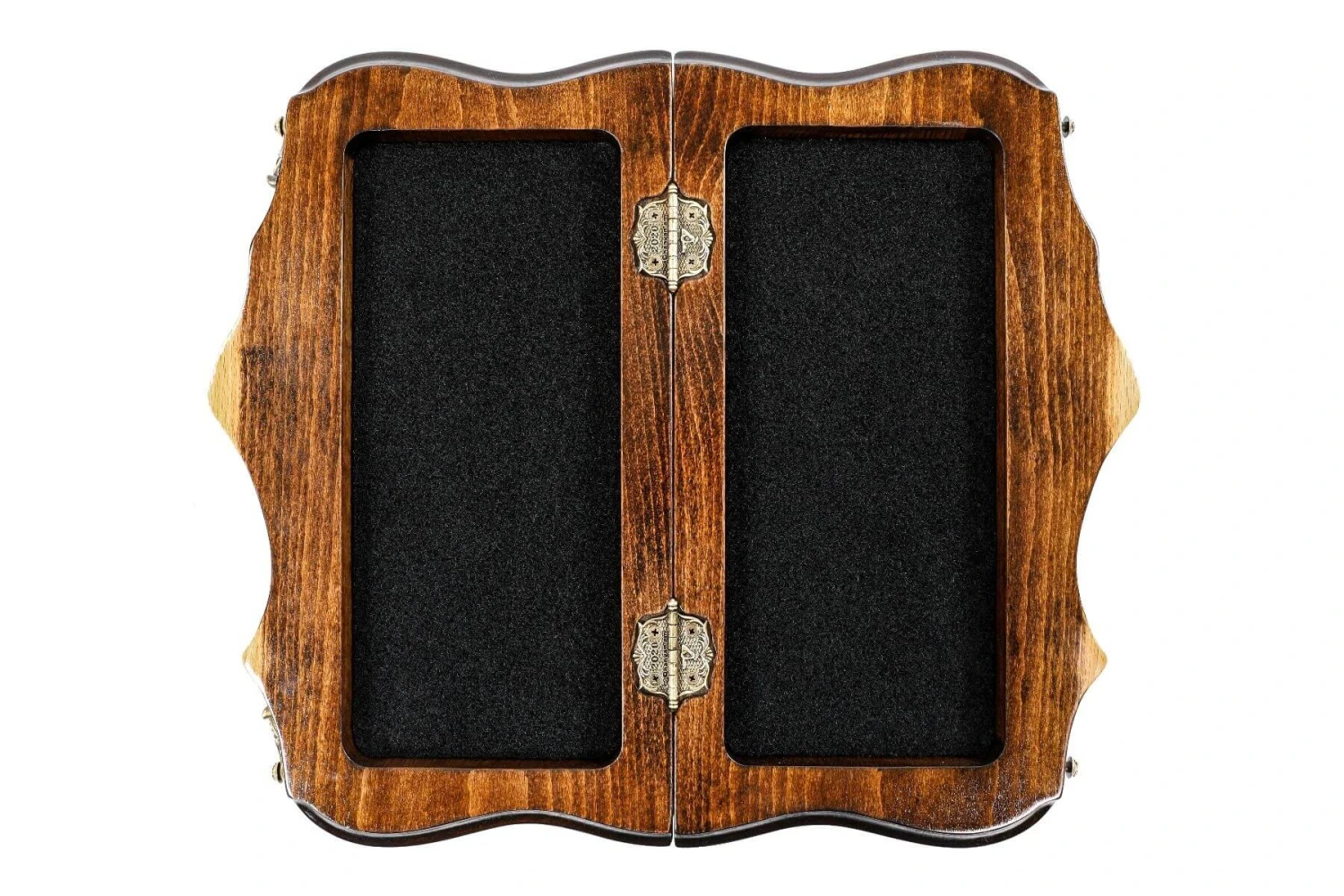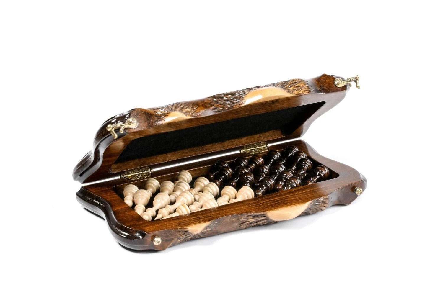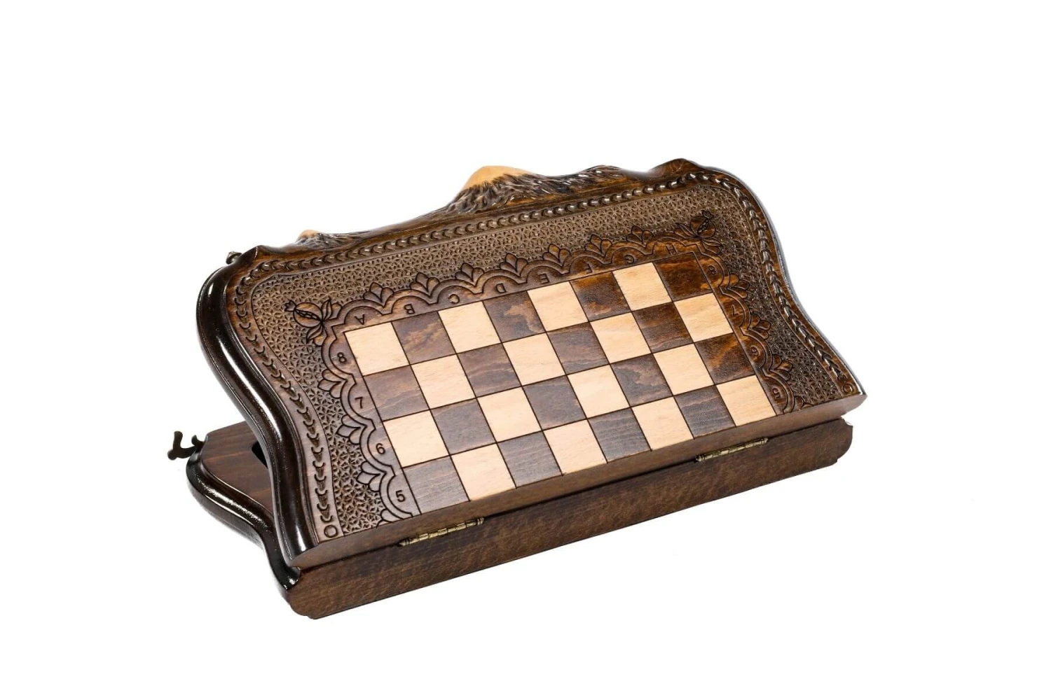 L’échiquier est intégralement pliable pour vous permettre d’y ranger les pièces du jeu d’échecs et de transporter ainsi le tout plus facilement. Vous trouverez aussi des jetons pour jouer au Jeu de Backgammon, tout le nécessaire pour des heures et des heures de réflexions et d’amusement ! L’échiquier étant donc pliable pour accueillir ces deux jeux, les charnières et la serrure sont fixées sur le bois massif. Ces charnières sont coulées en Bronze et subtilement décorées d’arabesques.