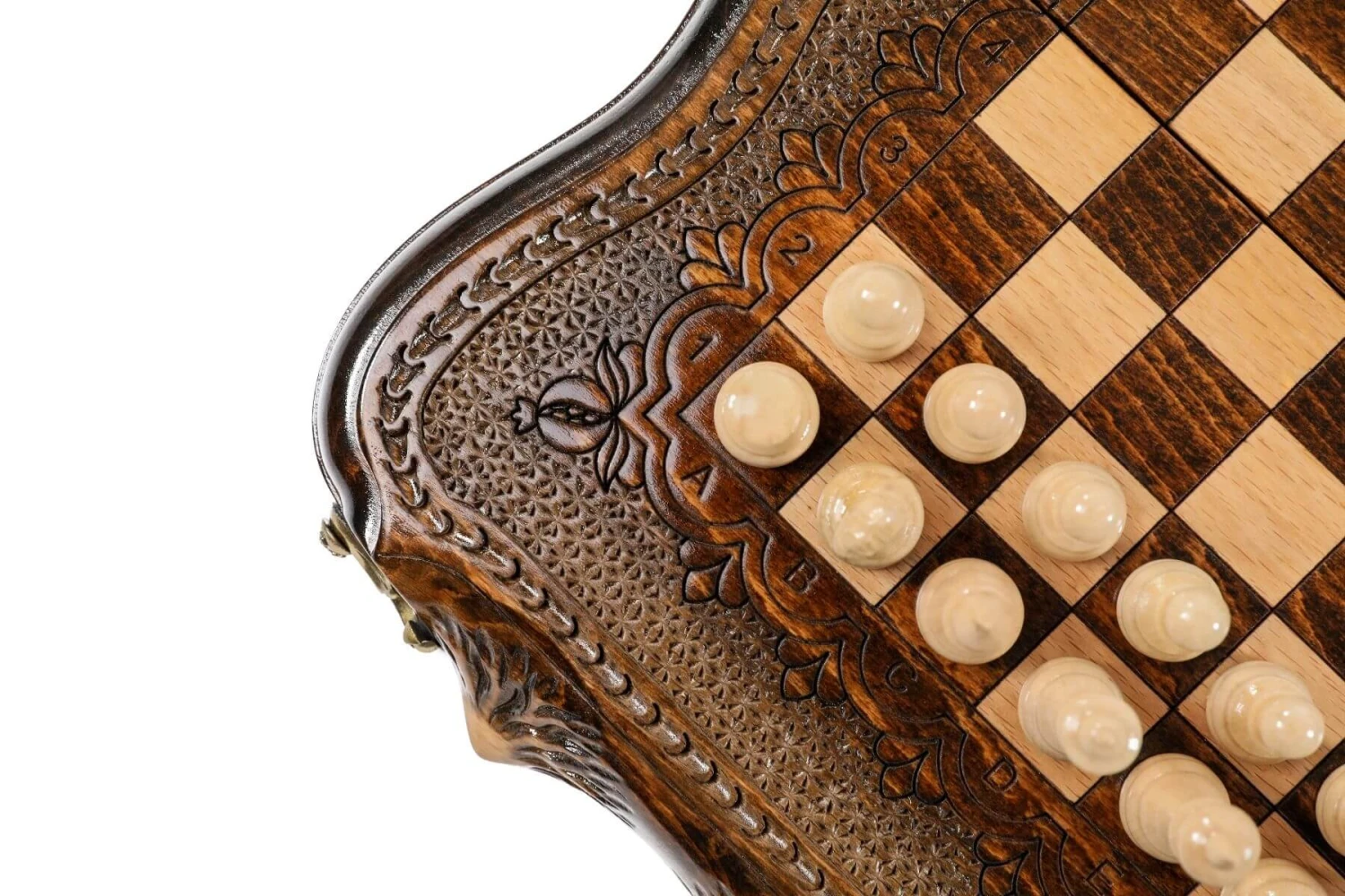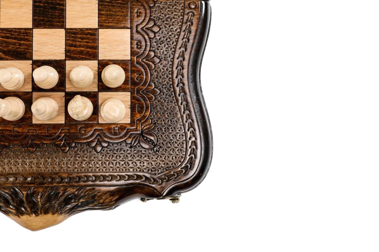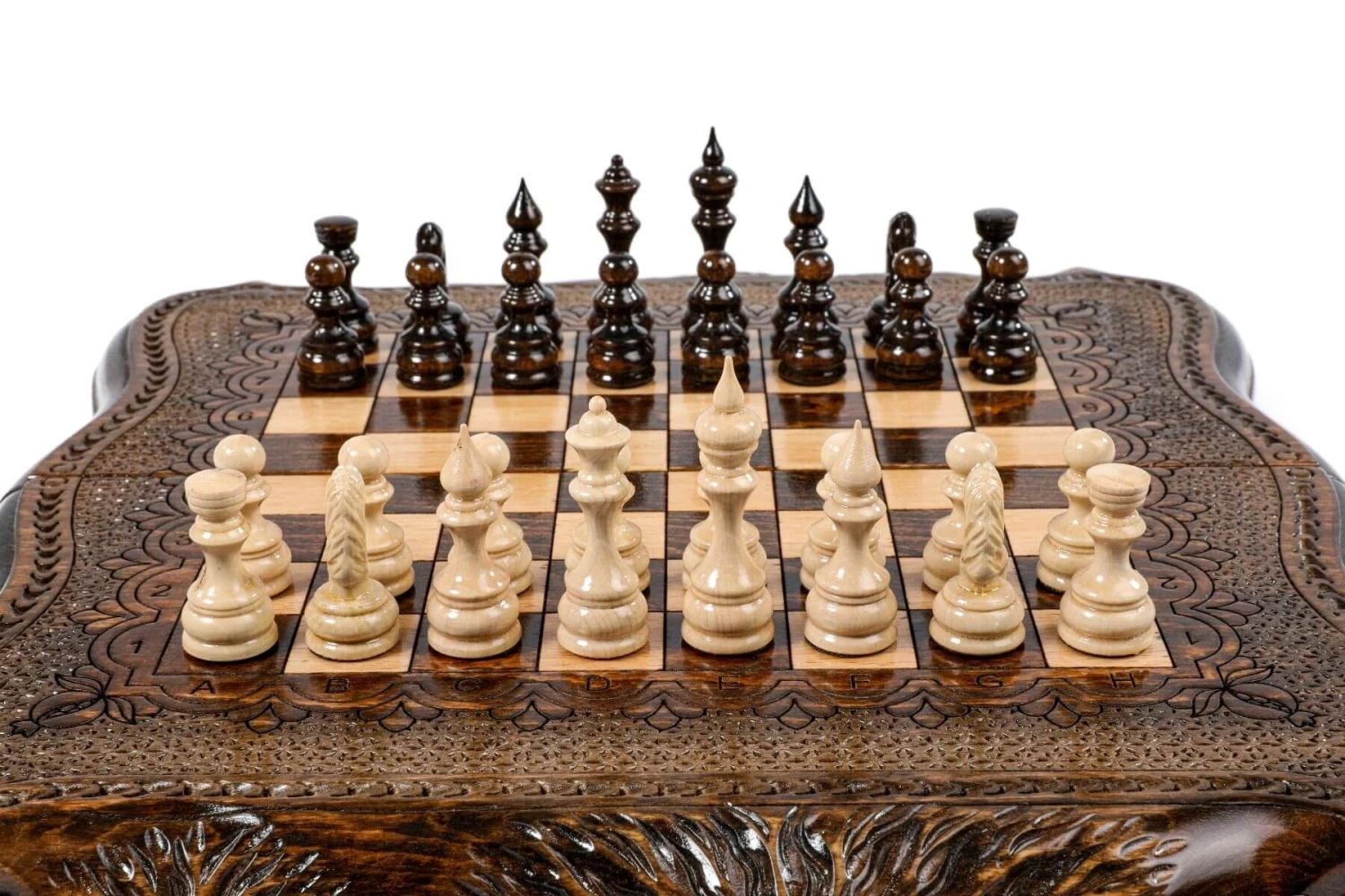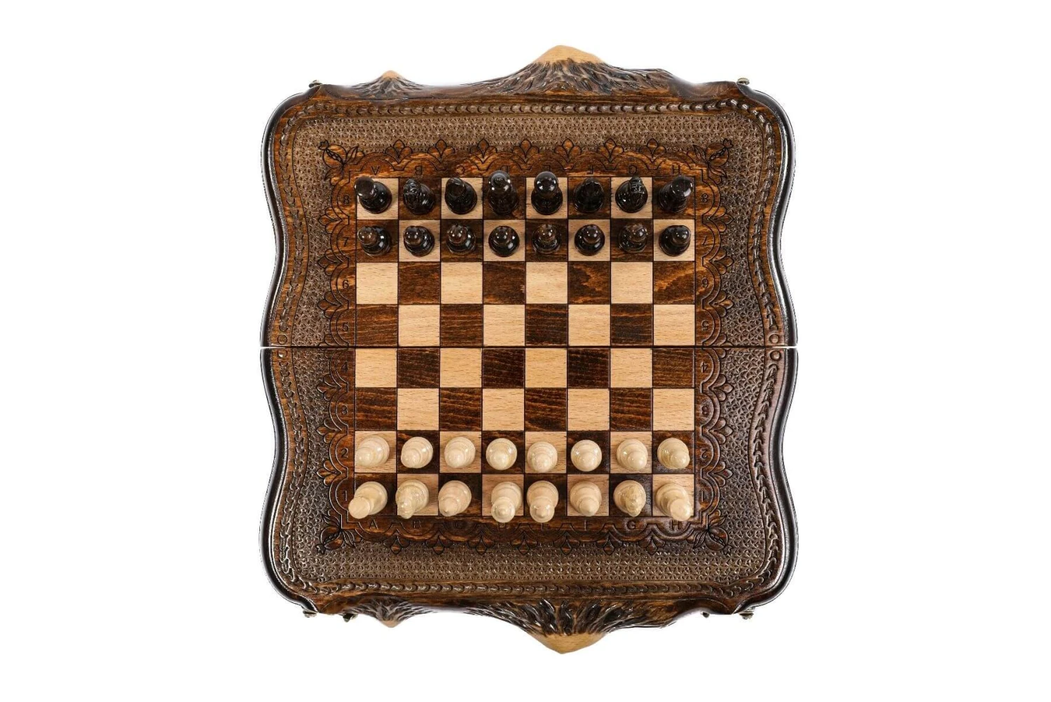 Les bords de l’échiquier, sont aussi gravés à la main par nos artisans, pour être ornés de belles montagnes ainsi que de chiffres et de lettres (gravés eux aussi) pour que vous puissiez exploiter pleinement vos capacités de joueur d’échecs.