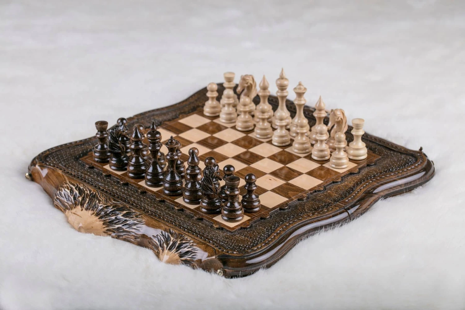 Ce magnifique échiquier 40×40 a été confectionné à partir d’une fine sélection de morceaux choisis de bois de hêtre. De belles montagnes pétries d’histoire aux sommets enneigés sont sculptées de part et d’autre de ce joli modèle.