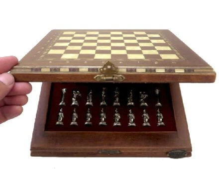 Cet échiquier en frêne se veut luxueux. Il est livré avec ses 32 pièces d’échecs en laiton et dispose d’un rangement au sein même de l’échiquier.