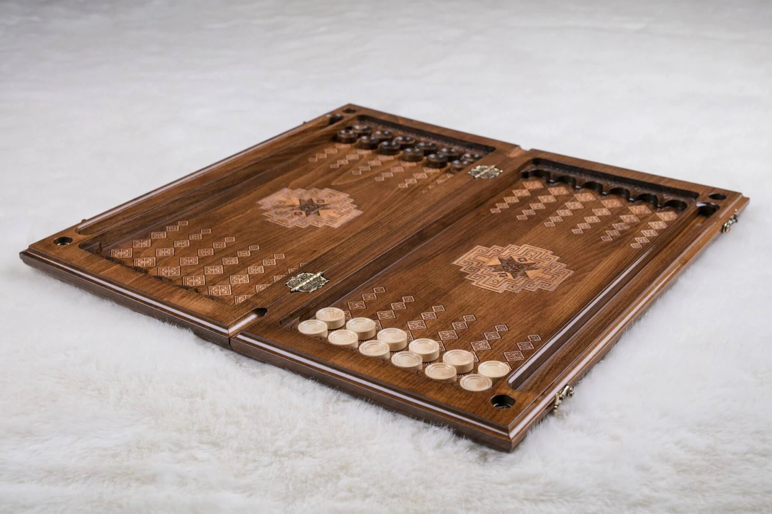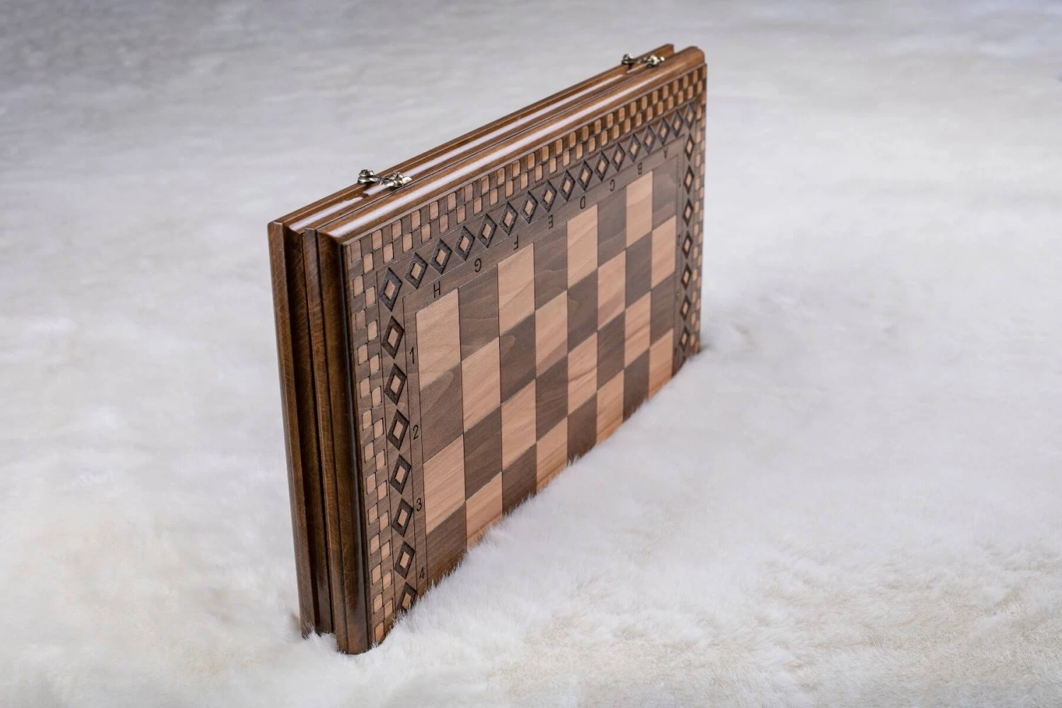Notre échiquier est de la plus haute réalisation. Comme vous pouvez le constater sur les photos, cet échiquier est parfaitement pliable pour vous permettre d’y mettre les pièces et jetons des jeux de Backgammon et d’échecs et ainsi transporter le tout où bon vous semble. L’échiquier étant pliable, les charnières et la serrure sont coulées en Bronze et évidemment délicatement gravées d’arabesques. Vous trouverez donc des gravures dans les moindres recoins de notre échiquier, pour nous les finissions qui font de nos créations de véritables œuvres d’art sont de la première importance.