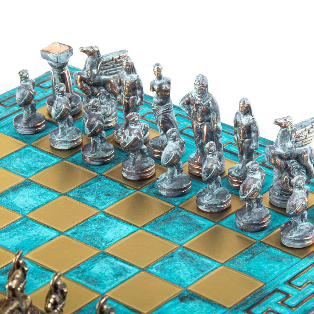 Le roi représente le célèbre héros semi-dieu, Hercule, le fils de Zeus, et le chevalier du célèbre cheval ailé, Pegasus. La figure de la reine est une réplique de la célèbre statue Aphrodite de Milos (200 avant JC) et l’évêque est Apollon, du temple de Zeus à Olympie (460 avant JC).