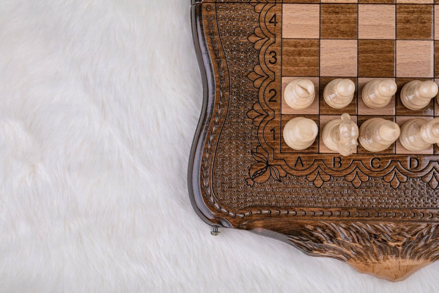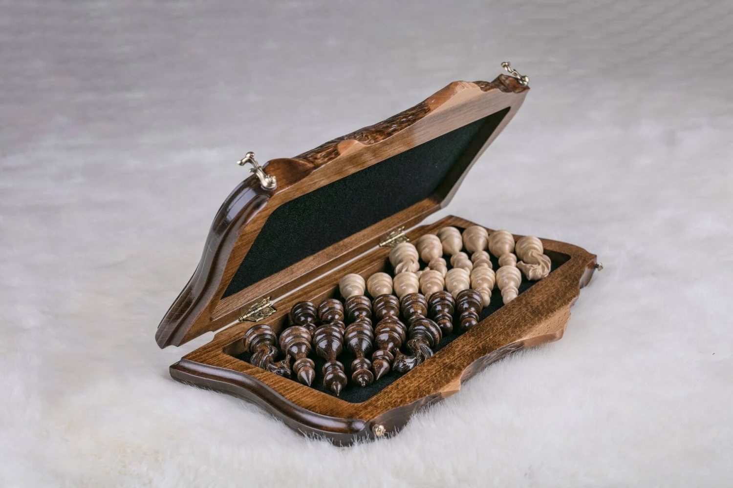 Ce magnifique échiquier a été confectionné à partir d’une fine sélection de morceaux choisis de bois de hêtre. De somptueuses montagnes pétries d’histoire aux sommets enneigés sont sculptées de part et d’autre de ce beau modèle. L’échiquier est soumis à un processus de fabrication complexe nécessitant 17 étapes devant être réalisées par 17 maîtres artisans différents.
