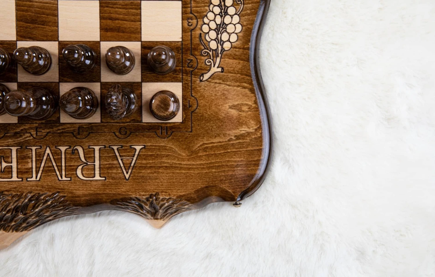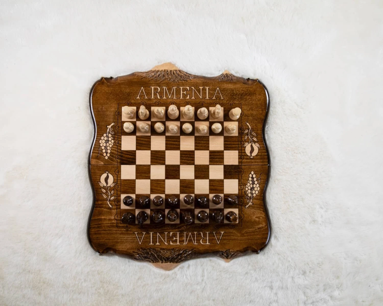 Les bords de l’échiquier, sont également gravés à la main par nos artisans, pour être ornés de belles montagnes ainsi que de chiffres et de lettres (gravés eux aussi). Le sigle « Armenia » est apposé aux deux extrémités de l’échiquier, pays phare du mont Ararat !