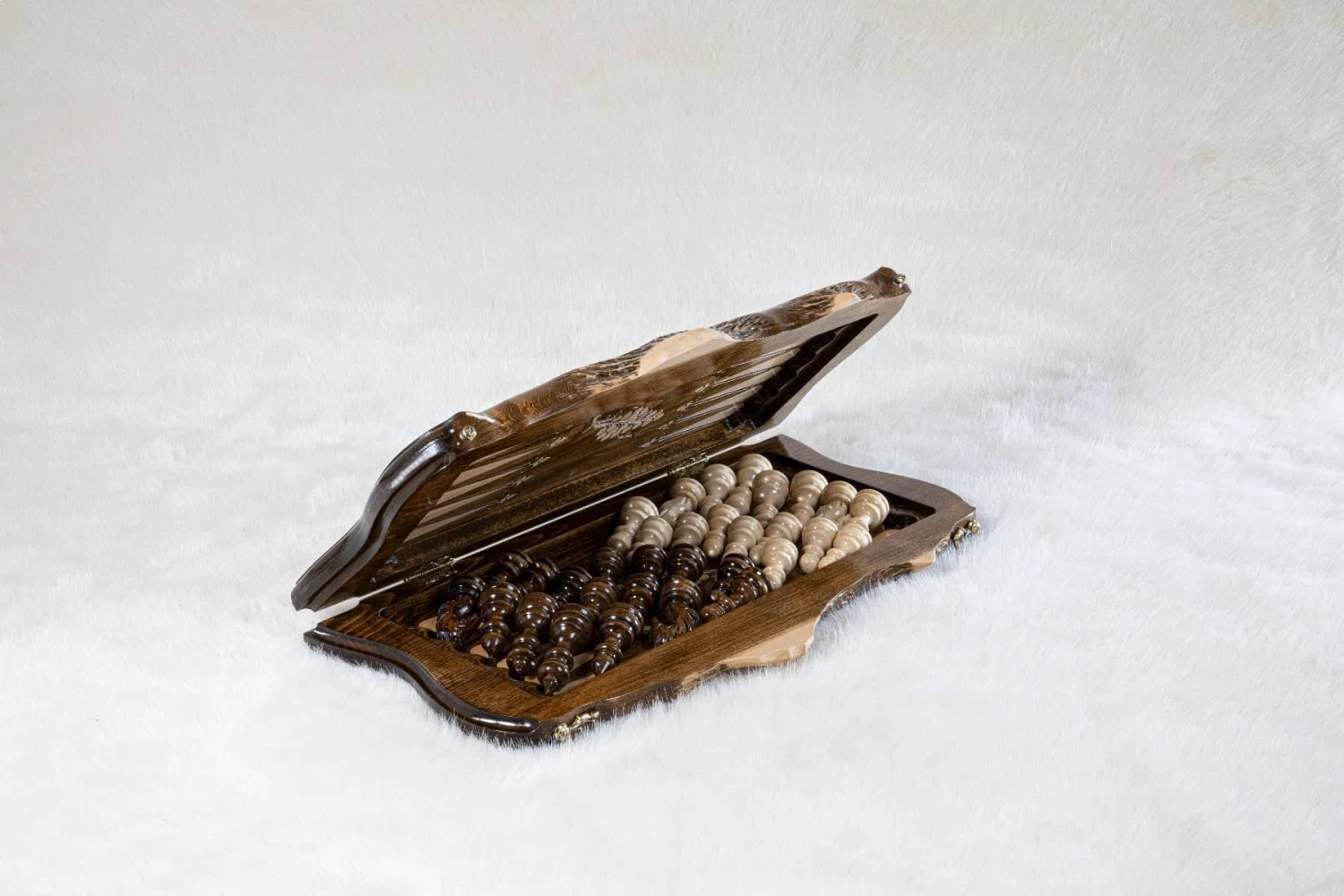 Ce magnifique échiquier oriental doit son originalité aux montagnes qui l’ornent et à sa méthode de confection : 17 étapes de transformation du bois ont été nécessaires à l’érection d’un nouvel échiquier. Les magnifiques monts enneigés qui l’ornent représentent le Mont Ararat, un lieu d’une grande importance dans la mythologie biblique !