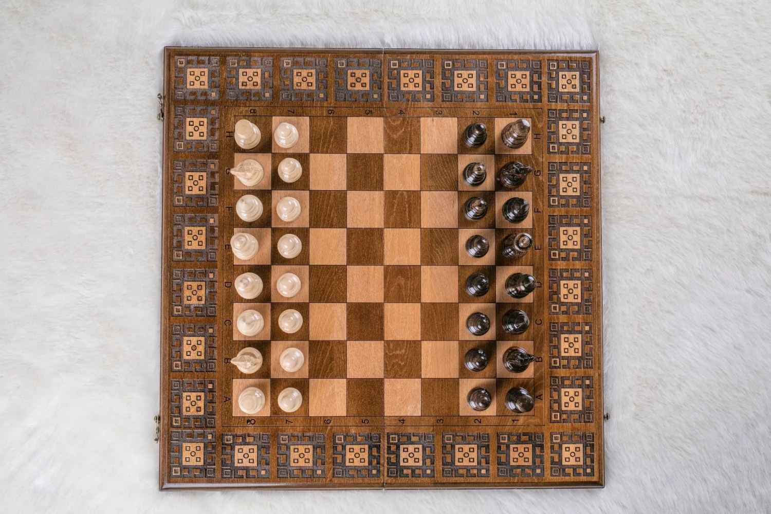 Que demander de mieux qu’un échiquier qui remplie la double fonction de décorer votre salon et de vous permettre de vous amuser avec vos proches ? Cet échiquier n’est d’ailleurs pas seulement un échiquier qui pourrait embellir votre intérieur, c’est aussi un jeu de Backgammon ! Vous pouvez admirer sur les photos les détails que nos artisans ont sculpté à la main dans le bois de hêtre. Ils l’ont fait avec tout leur savoir-faire et cela leur a nécessité 17 étapes, demandant chacune des spécialisations différentes. On ne peut que s’émerveiller devant ce travail maîtrisant conciliant connaissance du bois, géométrie et créativité.