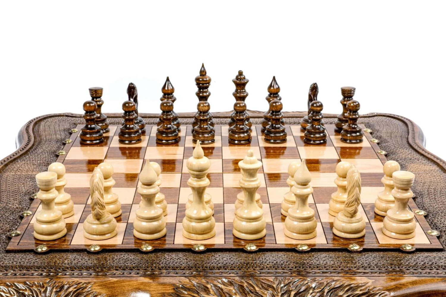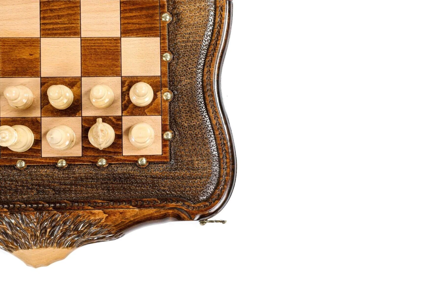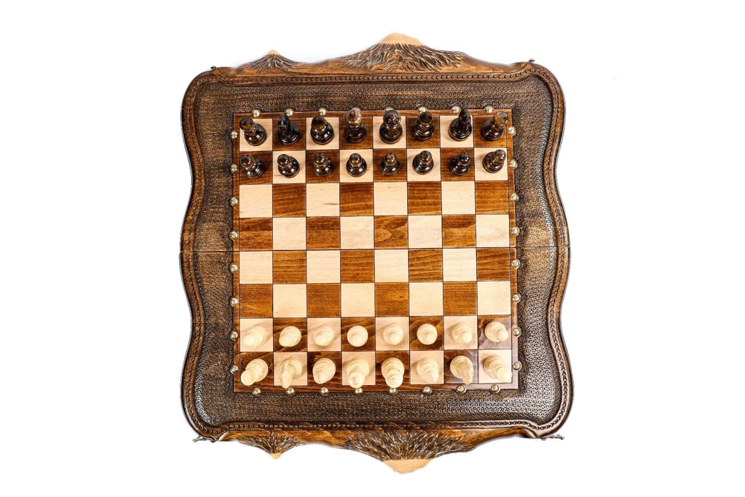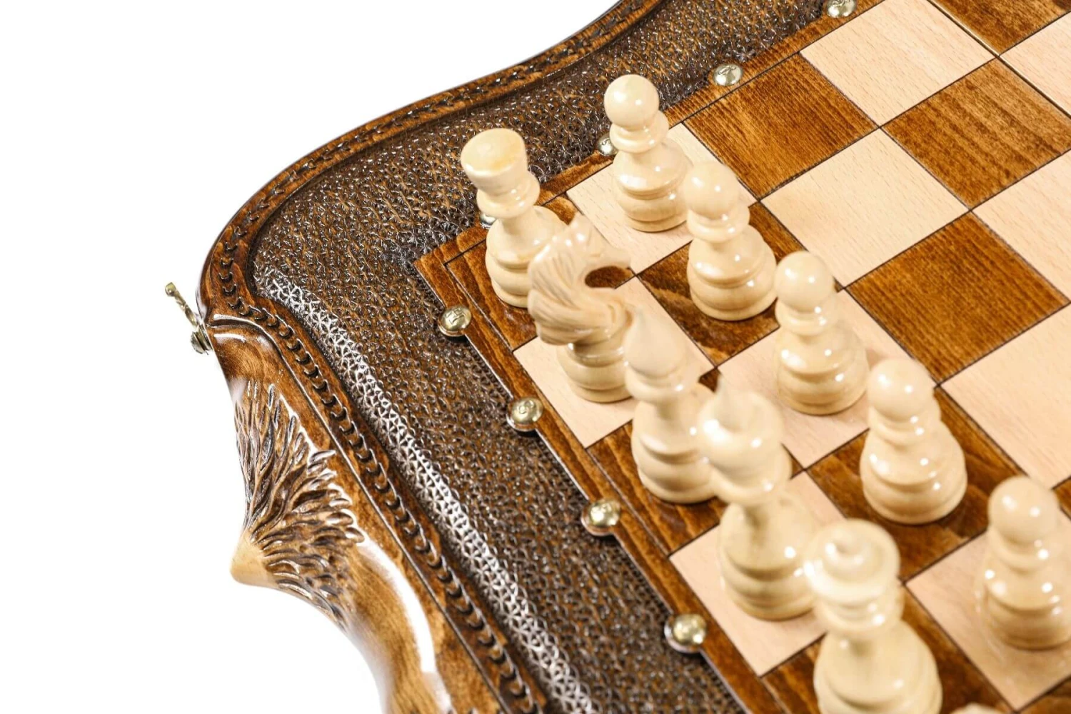 Si vous retournez l’échiquier, vous découvrirez un très beau plateau de backgammon, également ornementé de beaux motifs artistiques.