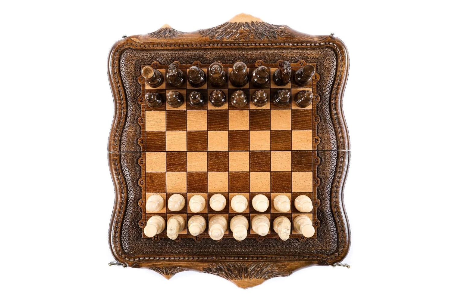 Les bords de l’échiquier, sont aussi gravés à la main par nos artisans, pour être ornés de belles montagnes ainsi que de chiffres et de lettres (gravés eux aussi) pour que vous puissiez exploiter pleinement vos capacités de joueur d’échecs.
