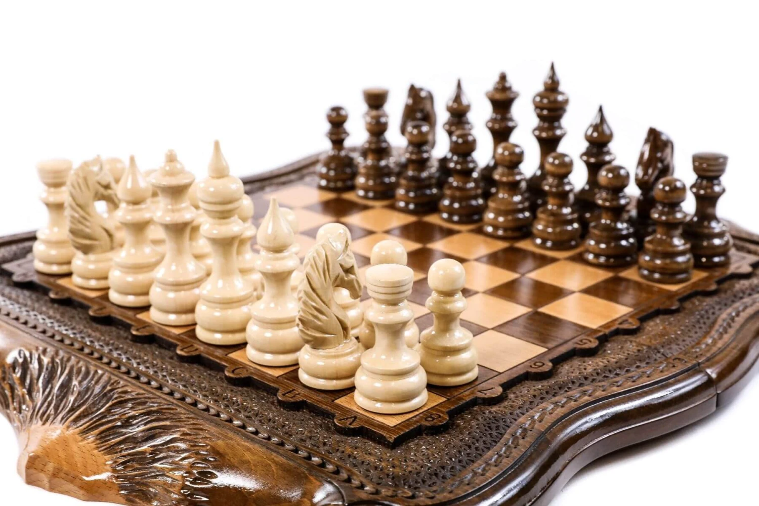 Ce somptueux échiquier rare doit son originalité aux montagnes qui l’ornent et à sa méthode de confection : 17 étapes de transformation du bois ont été nécessaires à l’érection d’un nouvel échiquier. Les magnifiques monts enneigés qui l’ornent représentent le Mont Ararat, un lieu d’une grande importance dans la mythologie biblique !