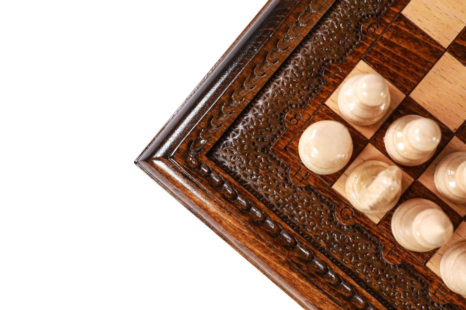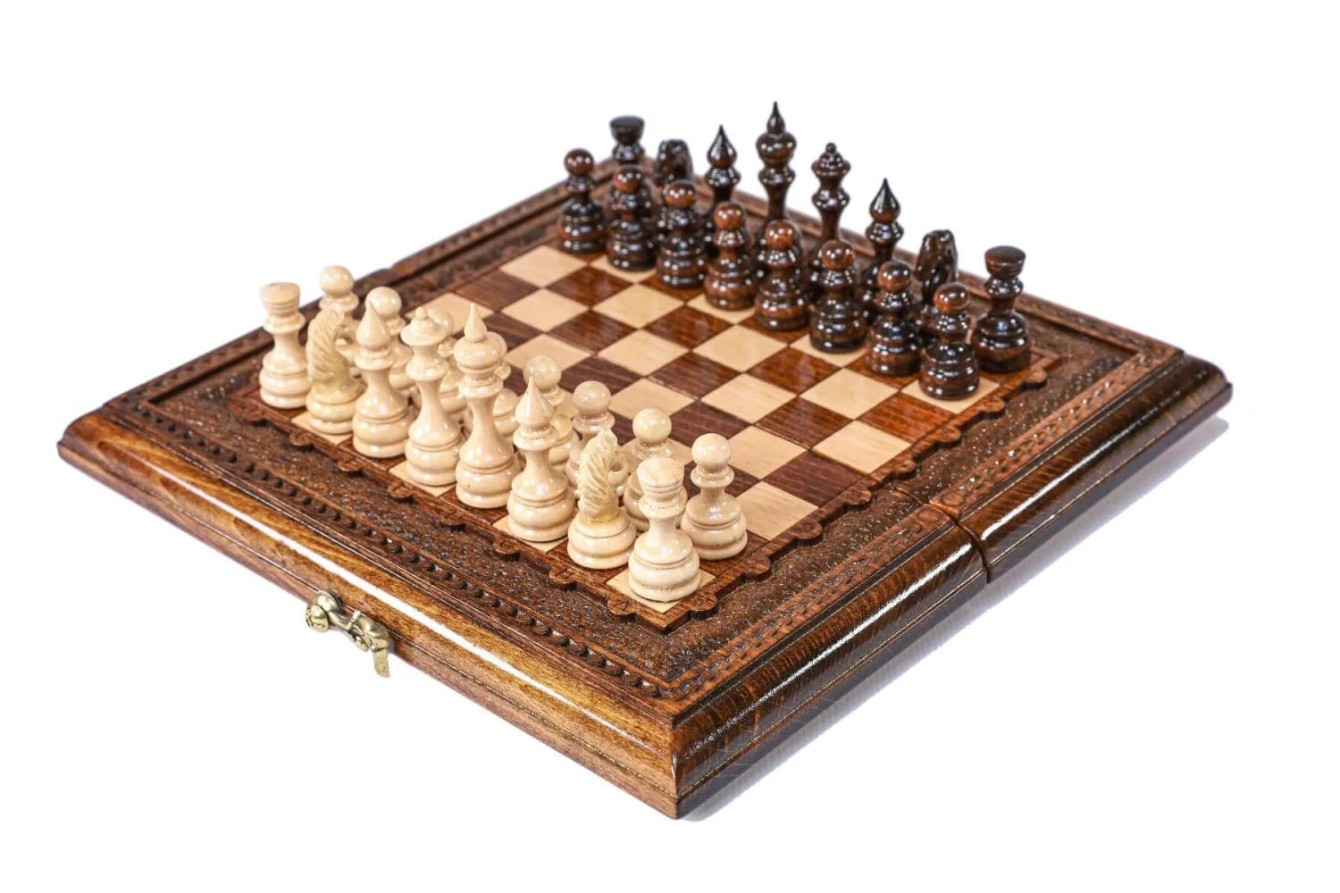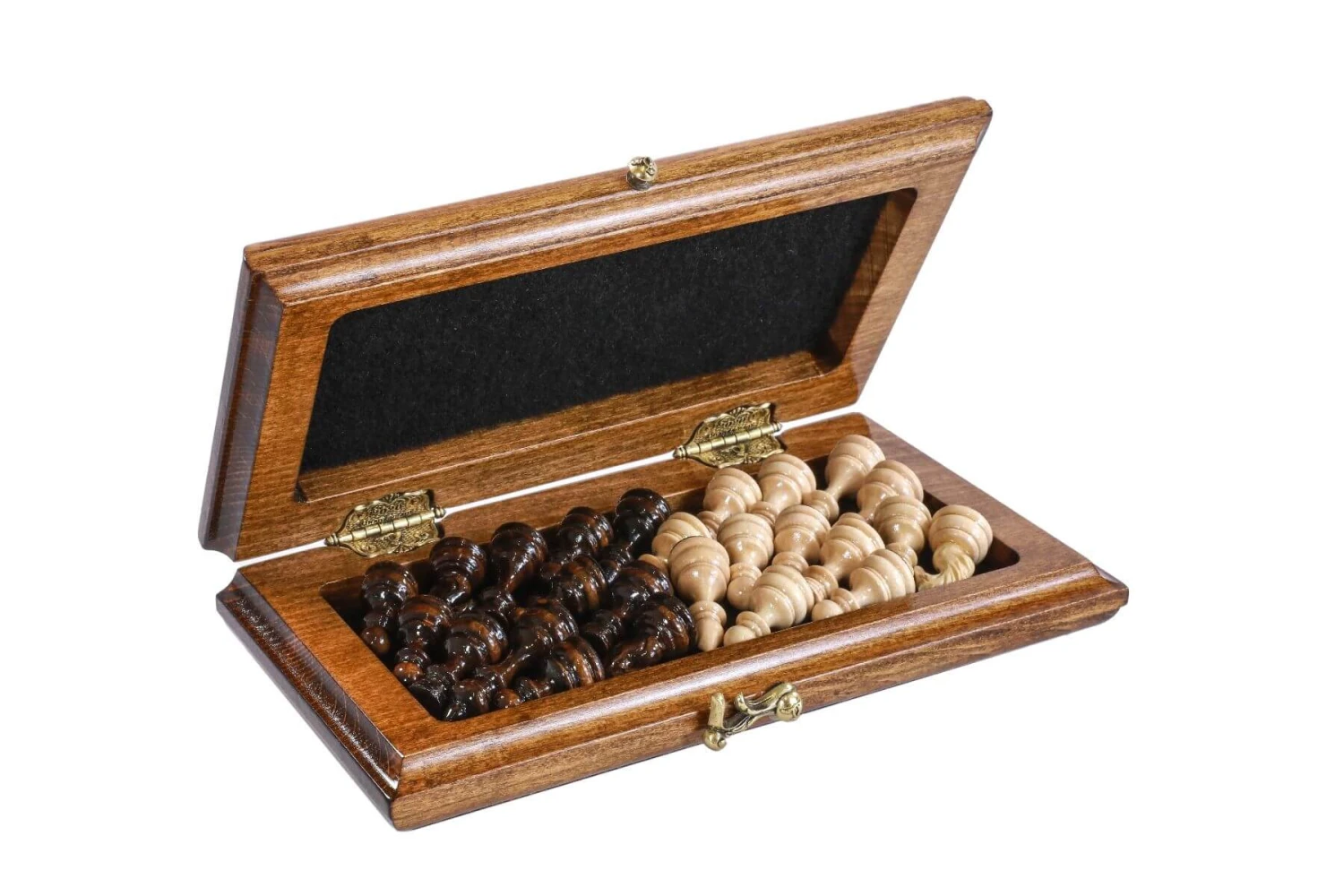 Il a été façonné à partir d’un bois de hêtre naturel avec une belle couleur brune. Les pièces du jeu d’échecs sont quant à elles confectionnées à partir de bois de hêtre et de noyer. Le dessous de chacune des 32 pièces d’échecs est enrichi d’un beau tissu de velours.