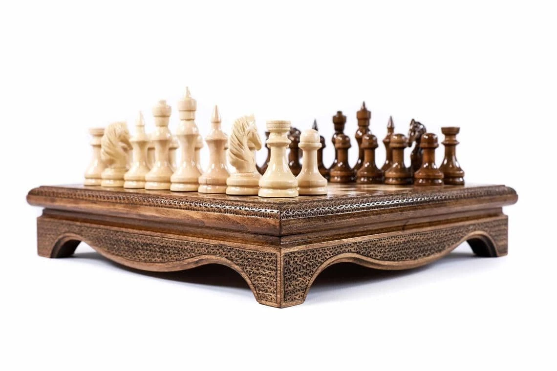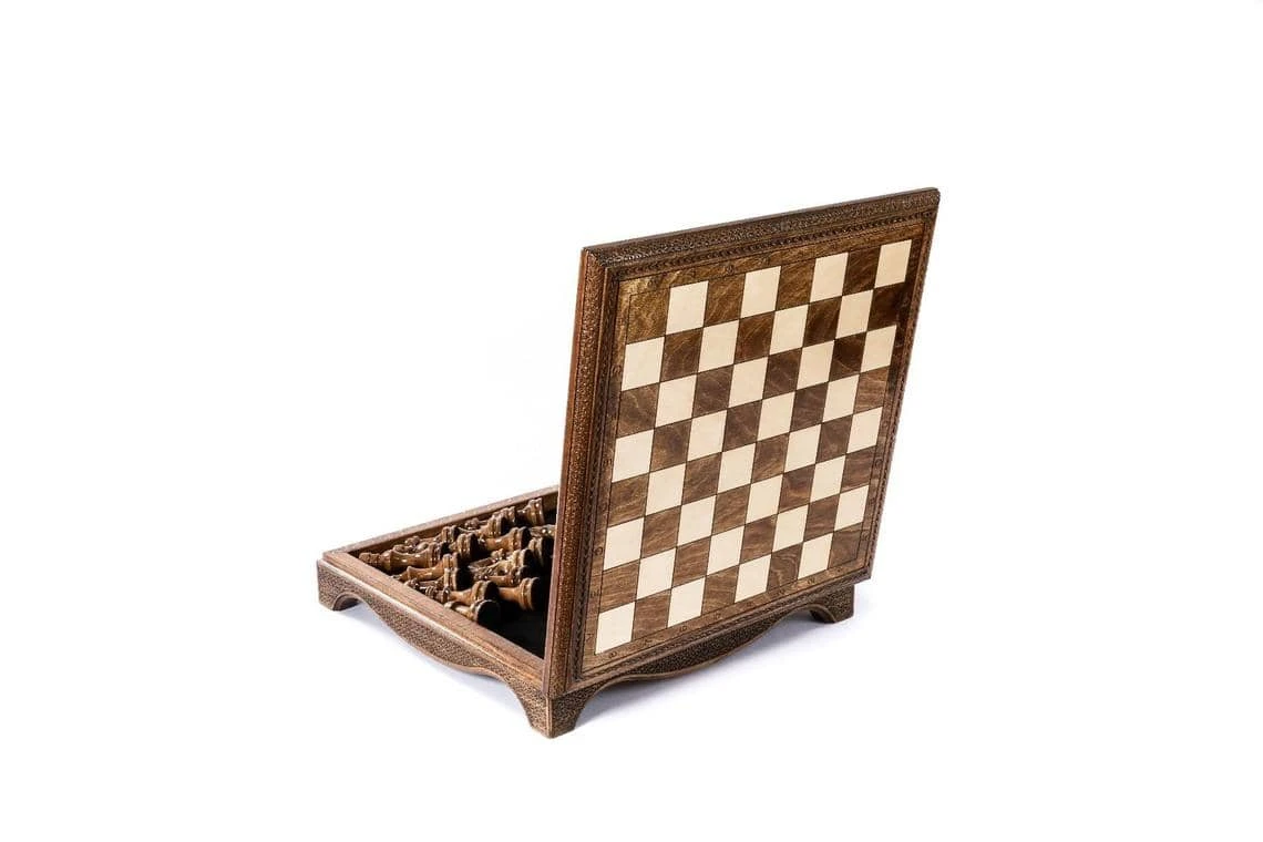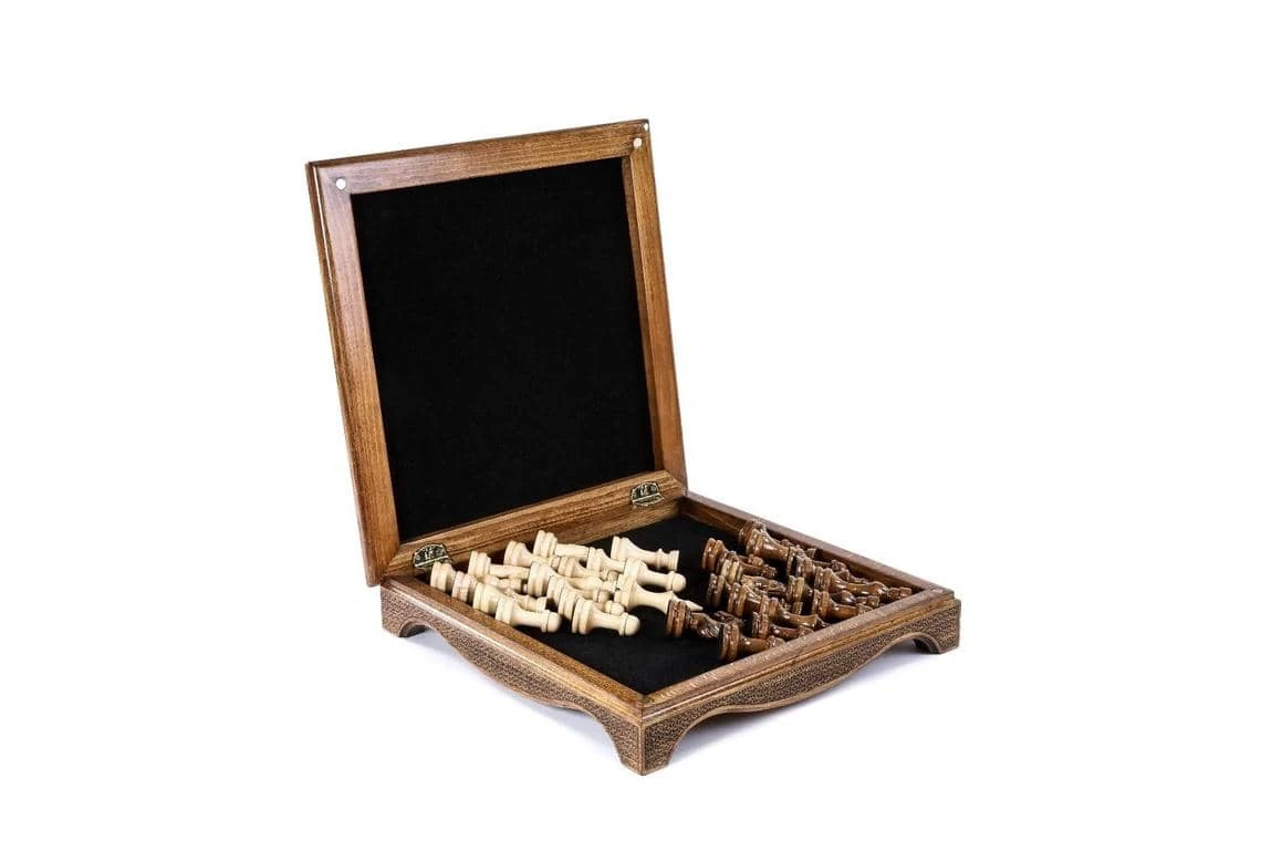 Ce jeu d’échecs au style unique est sculpté dans une sélection prestigieuse de bois de hêtre. Le support de boîte présente des bords et des pieds magnifiquement sculptés par une équipe de jeunes artisans passionnés par les échecs. Le dessus de l’échiquier s’ouvre élégamment pour que vous puissiez y stocker les 32 pièces d’échecs.