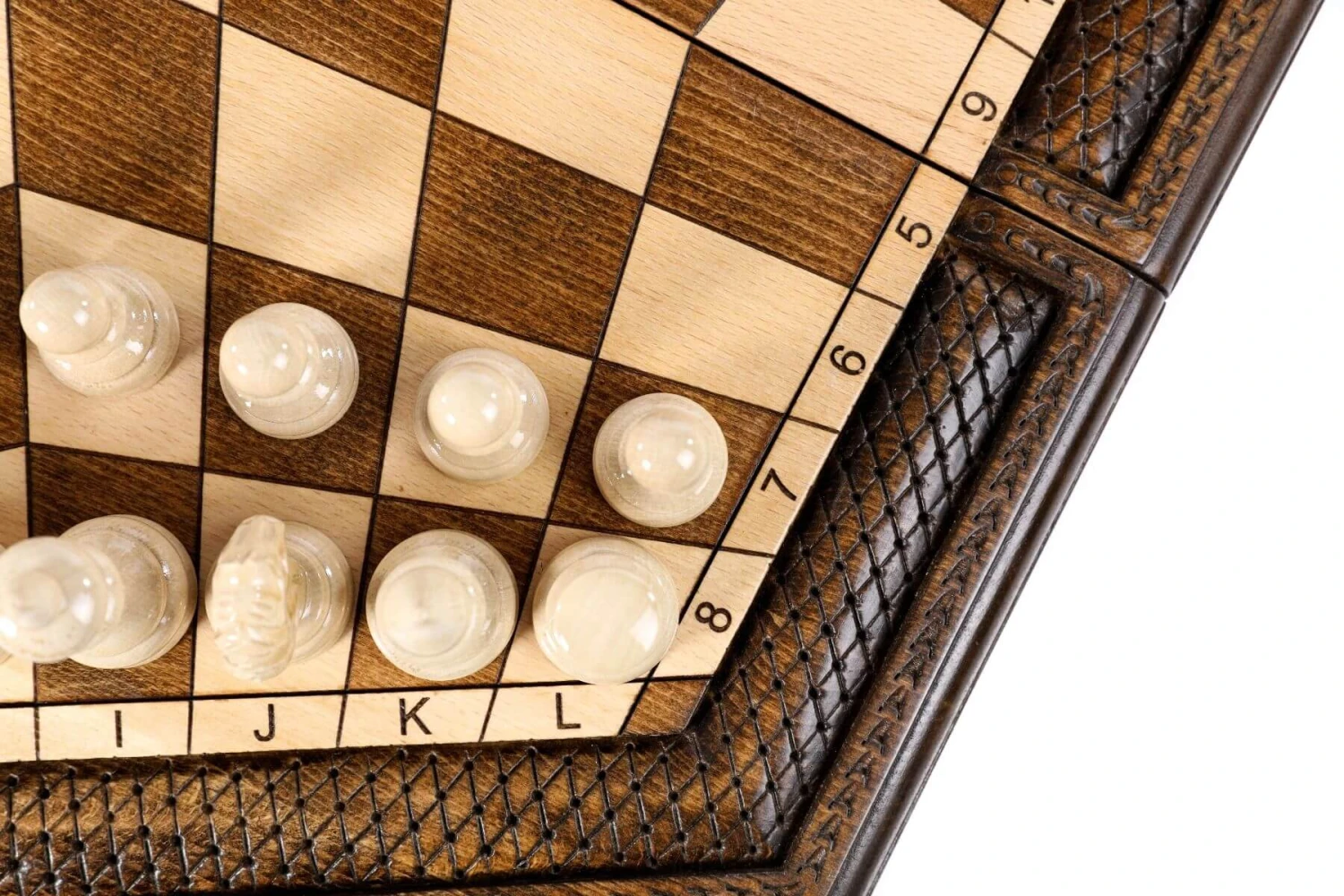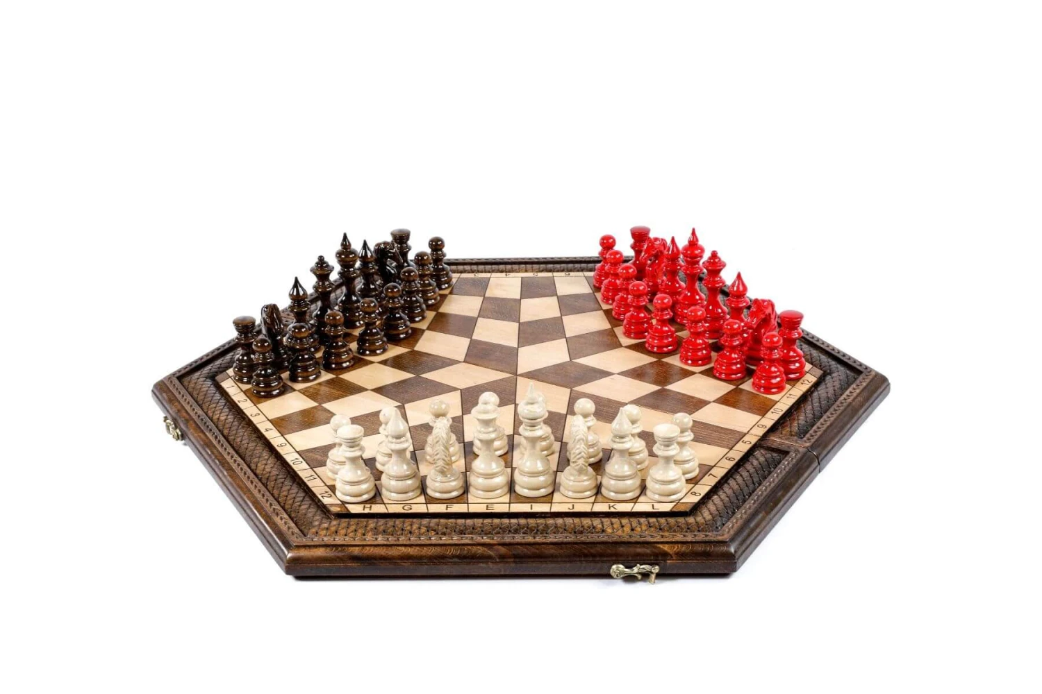 Travaillé dans les moindre détails, cet échiquier fait pour jouer à trois a été fabriqué par nos artisans et est le fruit d’une recherche minutieuse et acharnée. Comme vous pouvez le voir ce jeu d’échecs hors norme est réalisé avec une précision toute scientifique pour obtenir un hexagone ainsi que des cases d’égales mesures.
