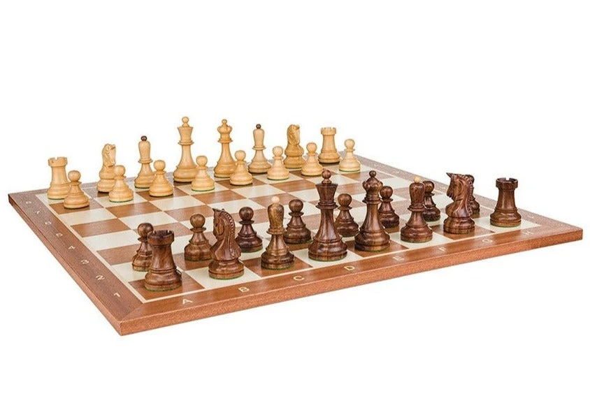 Le plateau d’échecs est également en bois, avec des chiffres et des lettres pour faciliter le jeu. Il mesure 54 cm et est doté d’une épaisseur de 1,4 cm. La taille des cases est conforme aux normes réglementaires des tournois (58 mm) et convient parfaitement aux pièces d’échecs de taille supérieure (hauteur du roi de 95-98mm). Ce plateau est disponible avec une bordure foncée en acajou ou une bordure claire en sycomore, avec une notation alphanumérique.