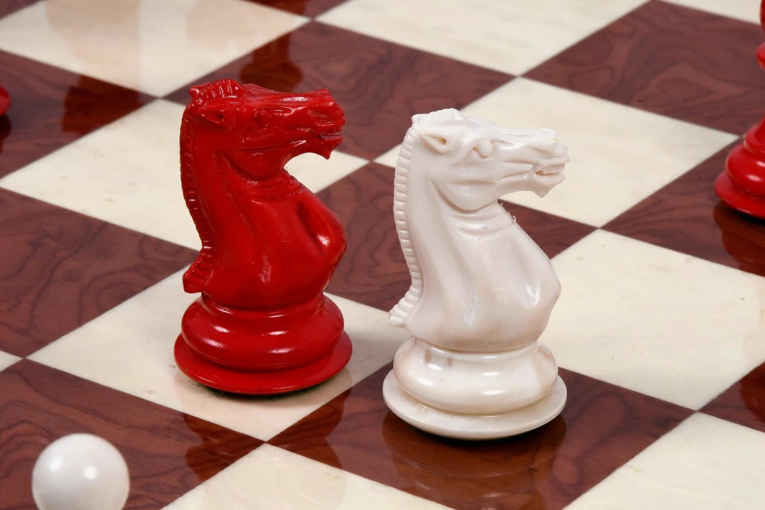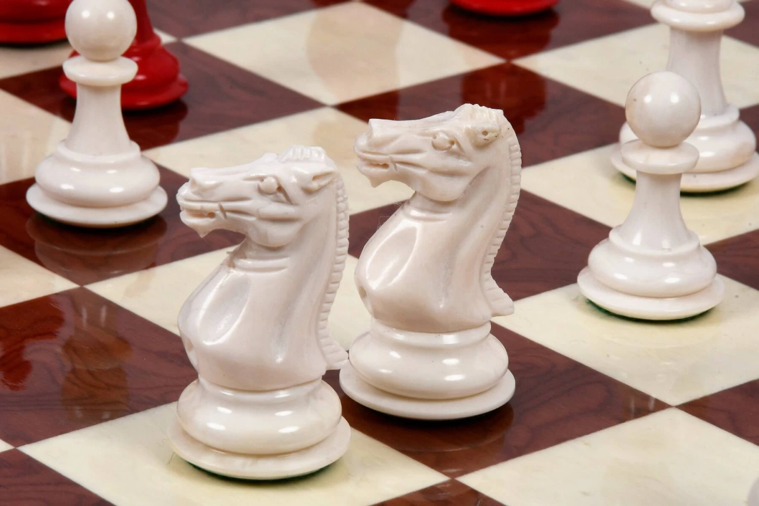 - Les pièces d’échecs sont en os de chameau ; l’échiquier est en bois de frêne rouge et d’érable