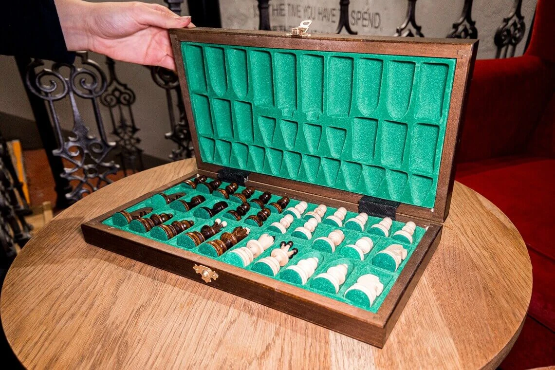 Adoptez ce beau plateau d’échecs fantaisie et emportez-le partout avec vous grâce à son rangement pratique