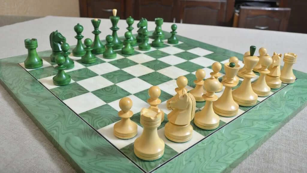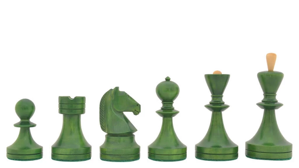 Ce jeu d’échecs pour échiquier vert saura vous séduire par son originalité ! Ces pièces d’échecs sont des reproductions du style soviétique de l’U.R.S.S.